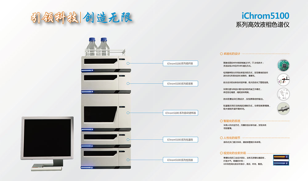 iChrom 5100高效液相色谱仪是大连依利特分析仪器有限公司凝结二十载智慧结晶,研发的具有自主知识产权的高效液相色谱仪。该产品同时也是国家重大科学仪器设备开发专项(2012YQ120044)的重要研发成果之一。iChrom 5100通过组织器模块对各单元部件进行供电、自动分配IP地址,实现整机联网操作,操作方便、运行稳定、结果准确。